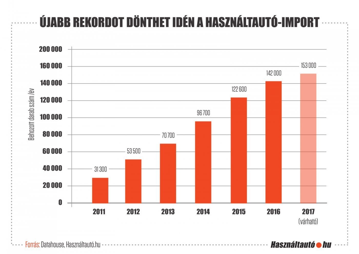 „Az utolsó három hónapban a bővülés éves összehasonlításban ismét kétszámjegyűre váltott, 11 százalék felett alakult – magyarázza Fodor László, a Használtautó.hu értékesítési vezetője. – Amennyiben ez az újabb lendület az év végéig kitart, az idei használtautó-import mértéke akár a 153 ezer darabot is elérheti.”