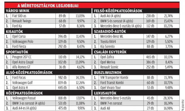 A kategóriák közül a kompaktoké a vezető hely (27,05% piacrész/+2,45% növekedés), nyomukban a középkategóriával (18,93%/-2,47%), a családi egyterűkkel (18,14%/-0,21%) és a kisautókkal (13,69%/+0,21%). Némiképp leszakadva jönnek a szabadidő-autók (9,26%/+1,01%), majd újabb komoly lépcsőfokkal lemaradva a felső-középkategóriások (4,33%/-0,58%), a kissé szabadon értelmezett besorolású sportautók (3,08%/-0,11%), a városi minik (2,69%/-0,22%) és a buszlimuzinok (2,21%/-0,07%). A sort a luxusautók zárják, a piaci jelenlét itt csupán jelzésértékkel bír (0,63%/–0,01%). Az összesített márkarangsorban a Volkswagen áll az élen (3057 db/12,08% piacrész), megelőzve az Opelt (2724 db/10,76%) és a Fordot (2561 db/10,12%). A dobogósok mögött nagy a tülekedés a Toyota (1632 db/6,45%), a BMW (1596 db/6,31%) az Audi (1537 db/6,07%) és a Mercedes-Benz (1526 db/6,03%) között, majd a Mazda (1202 db/4,75%), a Renault (1017 db/4,02%) és a Honda (857 db/3,39%) zárja a top 10-et.