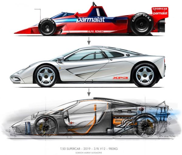 A világ legkönnyebb, legfürgébb szuperautójának ígéri a most készülő T.50-est Gordon Murray, hiszen a Porsche 911-esnél kisebb alapterületet elfoglaló, háromszemélyes sportkocsi mindössze 980 kg-ot nyom a mérlegen, és a Cosworth által fejlesztett 3980 köbcentis V12-es szívómotorja 650 lóerős – a 12 100/perces leszabályozási fordulatszám a legmagasabb az utcai autók között. Az autó váza kézzel gyártott karbon utascella, a motor és a hatfokozatú, kézi kapcsolású váltó is szerkezeti tartóelem.