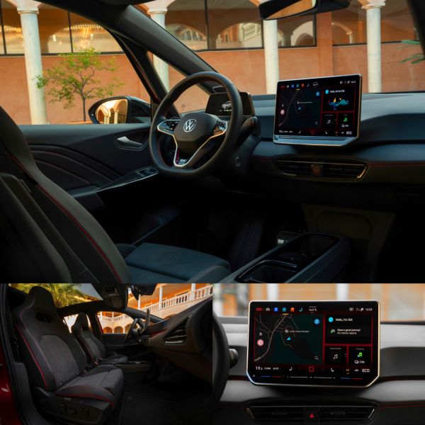 A Volkswagen ID.3 GTX egyedi első lökhárítót kap gyémántmintás ráccsal és nyíl alakú menetfényekkel és megvilágított márkajelzésekkel, a küszöböt, diffúzort és a tetőt minden esetben feketére fényezik, alapáron adják a 20 colos Skagen felniket. Műbőr/szövet kárpitot használnak elöl sportülésekkel, a piros díszvarrás itt és a kormánykeréken is megjelenik, a műszerfalburkolat puha.