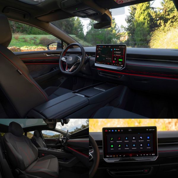 A középkategóriás modellnél csak kombi karosszériával adják a sportos körítést, tehát csak az ID.7 Tourer GTX lesz elérhető. Itt is új az első lökhárító, ugyanazt a gyémánt mintás hűtőrácsot és nyíl formájú menetfényeket látjuk a megvilágított márkajelzésekkel együtt, mint az ID.3 GTX-nél, a 20 colos Skagen felnik is ugyanazok. A műbőr/szövet kárpitnál már piros csövezést is használnak, egyedi a kormánykerék.