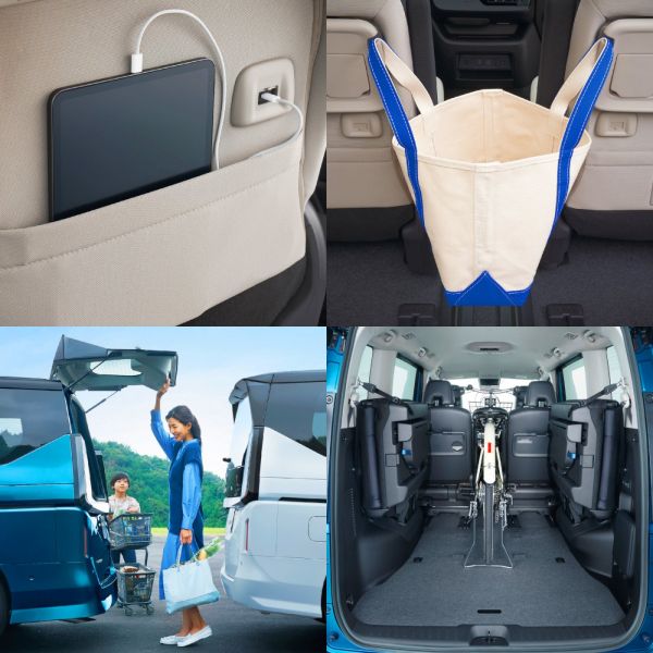 Különösen nagy méretűek az ablakok, a második sortól hátrafelé felhúzható árnyékolók is vannak, az utasülés felőli oldalon érintés nélkül is működtethető a hátsó elektromos mozgatású tolóajtó. Az elődhöz képest 12 cm-rel több hely jut az első sorban utazóknak, ezt a többletet a második sor lábterére is lehet fordítani, hiszen ott sínen tologathatóak az ülések. Minden egyes ülőhelyhez dedikált okostelefon-kütyütartó zseb tartozik, bőven van USB-töltő is, a pohártartókban a japánban használt fél literes karton italosdobozok is elférnek, a fedélzeti wifi 8 eszköz kezelésére képes. Ehhez hozzájönnek még olyan apróságok, mint a szatyorakasztó a két első ülés támlájának belső felén, így oda szemetesként használható zacskót lehet helyezni, az üléskárpit víztaszító, ami megkönnyíti a takarítást.