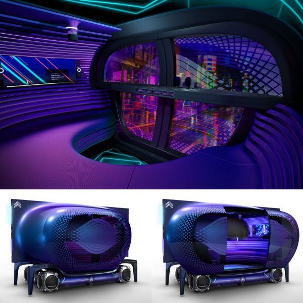 A szögletes gerincű, ovális alakú Immersive Air fedélzetén többen is utazhatnak. A sötét üvegből készült külső falra csillogó fémes organikus minta vetül. A podot ezek a titokzatos fényű high-tech elemek teszik különlegessé. A csak egyik irányból átlátszó, sötétített üvegű dupla tolóajtó és a panorámaablak megfelelő kilátást, ugyanakkor kellő intimitást biztosítanak. A pod belsejében az utasok zenét hallgathatnak, karaokézhatnak, videojátékokat játszhatnak, illetve filmet nézhetnek. A beltér különleges világa azonnal magával ragadja az utasokat. Az egyes dekorelemek között elhelyezett fényforrások és a 360 fokos hangzás ideális környezetet teremtenek a karaoke-énekléshez és a videojátékokhoz. Az utasok által választott zenét kísérő hol dinamikus, hol nyugtató hatású digitális animációk pedig csak tovább fokozzák az élményt. A 4K kijelző, a hangulatvilágítás és a mennyezetbe épített mikrofon készen áll a produkcióra: jöhet az előadás! Az enteriőr a Citroëntől megszokott módon ultrakényelmes: az ergonomikusan kialakított tér és a puha párnák igazi kikapcsolódást ígérnek. A piros és kék részletekkel tarkított különleges szövésminta irizáló hatást kelt, és fokozza a high-tech hatást. Az Immersive Air podban egyszerűen minden adott az utazás közbeni felhőtlen szórakozáshoz.