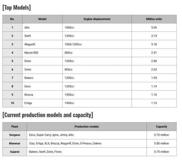 Március végén érte el az összesített 30 milliós gyártási darabszámot a Suzuki indiai részlege, a 40 év és 4 hónap alatt elért teljesítmény túlszárnyalja a japán teljesítményt, ahol ehhez 55 évre és 2 hónapra volt szükség. Ehhez képest Esztergomban 32 év alatt „mindössze” 4 millió autót gyártottak – nálunk csak 1 üzem van. Indiában 1983 decemberében kezdték meg a Maruti 800 by Maruti Udyog gyártását. Jelenleg 3 gyárral rendelkezik a Suzuki a szubkontinensen (Gurgaon, Manesar, Gujarat) évi 2,25 millió autós kapacitással, 2025-ben (Kharkoda) és 2027-ben (Gujarat) átadnak még 1-1 gyárat, amelyekkel már évi 4 millió példányra nő a gyártókapacitás.
