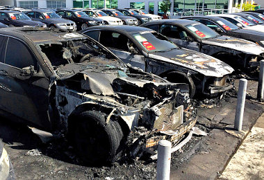 Szerda éjjel, 22:40 körül kapták a tűzoltók a segélyhívásokat, miután egy ismeretlen tettes felgyújtotta a Santa Monica-i BMW márkakereskedés előtt parkoló autókat. Amikor a tűzoltók a helyszínre értek, még csak három autó égett, de az gyorsan terjedt; végül négy autó semmisült meg, egy pedig megsérült.