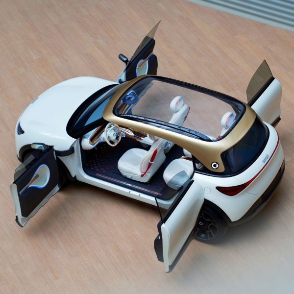 Nem tudjuk, mi lesz a mikroméretű városi autó jövője, az immár 50:50%-ban a Mercedes-Benz és a Geely közös vállalkozásának számító Smart márka jövőképét mutató #1 tanulmány egy 4,3 méter hosszú szabadidő-autó. Ezzel valahol a kisautó- és a kompakt kategória határán egyensúlyoz az autó, a 2,75 méteres tengelytávolsága a nagyra nőtt kompakt SUV-kkal van egy szinten. A mai formavilágot továbbfejlesztve alakították ki az új arculatot, búcsúzott a Tridion biztonsági cella, helyette vannak LED-csíkkal összekötött lámpák és lekerekített vonalvezetés, a 21 colos felniket kitolták a karosszéria sarkaiba.