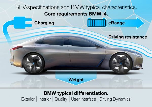 Méretben valahol a márka két legnépszerűbb személyautója, a 3-as és az 5-ös között helyezkedik majd el a BMW i4-es Gran Coupé, amelyet kezdettől fogva akkumulátoros-elektromos autónak terveztek. Az ötödik generációs eDrive hajtást kapja majd, amely először a jövőre érkező iX3-as szabadidő-autóban jut majd szerephez, az i4-et követően pedig az iNext is megkapja majd.