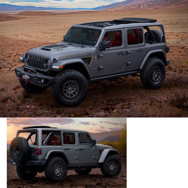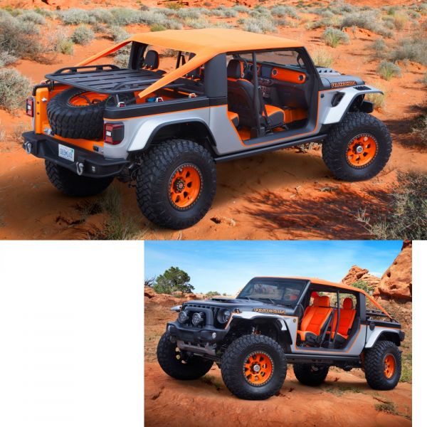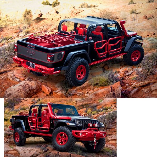 A Jeep Performance Parts és a Mopar több mint 35 kiegészítőjét szerelték fel a Gladiator pickupra, ezeket mind vörösre fényezték, hogy egyértelmű legyen, melyek azok. De az autóhoz közel kerülő érdeklődők dolgát is megkönnyítik azzal, hogy mindegyiken ott a QR-kód, amelynek a leolvasásával rögtön meg is rendelhetik a kívánt kiegészítőt. 5 centit emeltek a futóművön, a 17 colos felnikre 37 col átmérőjű BFGoodrich KM3-as abroncsot szereltek, nem nyúltak a 3,6 literes V6-oshoz, de a tetőre kivezették a szívósort és dupla Mopar-kipufogórendszert építettek be.