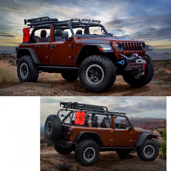 Azt példázza a kalitka elnevezésű tanulmány, hogyan lehet a Jeep Performance Parts kiegészítőkkel tovább fokozni a plug-in hibrid hajtású Rubicon modell terepképességeit. A név onnan jön, hogy az 5 centis csövekből készített védőkeret az autó alá is benyúlik, ahol a a két „sín” között helyezik el az alsó védőlemezeket. A futóművön 5 centit emeltek, kifejezetten a 4xe-hez készültek a Fox-lengéscsillapítók, a kerékjáratok átalakításával bőven van mozgástere a 17 colos felnikre szerelt 37 col átmérőjű terepabroncsoknak. Eltávolították a szélvédőt, több kiegészítő fényszórót szereltek fel.