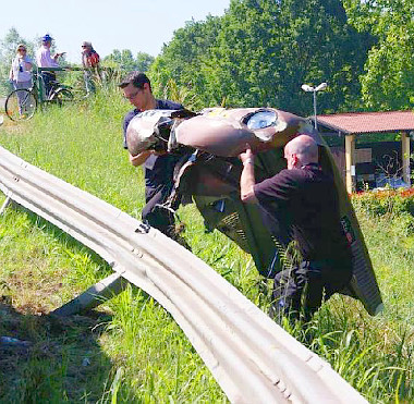 Vasárnap délelőtt fél 11 körül Reggiano közelében egy vasúti felüljáró töltésén veszítette el uralmát a brit Bernard Kuhnt az 1952-ben gyártott Jaguar C-Type fölött, amely során a jármű a szalagkorlátnak csapódott. Szerencsére sem a sofőr, sem a belga navigátora, Jonathan Vandenbroeck nem sérült meg a balesetben, azonban az autó orrát borító hatalmas karosszériaelem leszakadt. Noha a gyár által biztosított nyolc korabeli jármű egyikéről van szó, a balesetről hallgat a Jaguar, és az egyébként az utat végig-twittelő utas se emlékezik meg a balesetről.