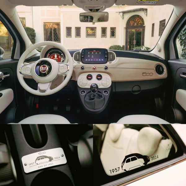 Elefántcsontszínű szövet/Poltrona Frau kárpitot kapnak az ülések, a támlára nyomják a „One of 1957” feliratot, a kézifékkar mögött helyezik el a limitált szériára utaló plakettet, a hátsó oldalablakon is megjelenik ez a motívum. Európában az 1,0 literes, 3 hengeres lágyhibrid benzinmotorral (70 LE) kínálják a Fiat 500 Collezione 1957-et, Japánban még az 1,2-es 4 hengeressel (69 LE) adják a limitált szériát.