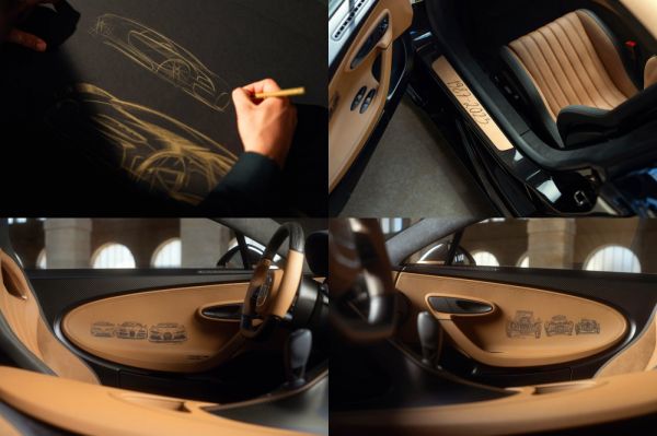 A karosszériára kézi munkával vitték fel 45 legendás Bugatti típus rajzát – a vezetőoldalon 19, az utasoldalon 26 látható –, csak ez 400 munkaórát vett igénybe, ugyanis a formatervezői akár többször is újrarajzoltak egy-egy autót, ha annak nem pontosan megfelelő volt a mérete/elhelyezkedése. Az alap is különleges, a Doré névre keresztelt arany színt ide keverték ki, amelynek felülete lehetővé teszi, hogy arra ceruzával rajzolhassanak, ez fokozatosan megy át előrefelé a Nocturne Black színbe.