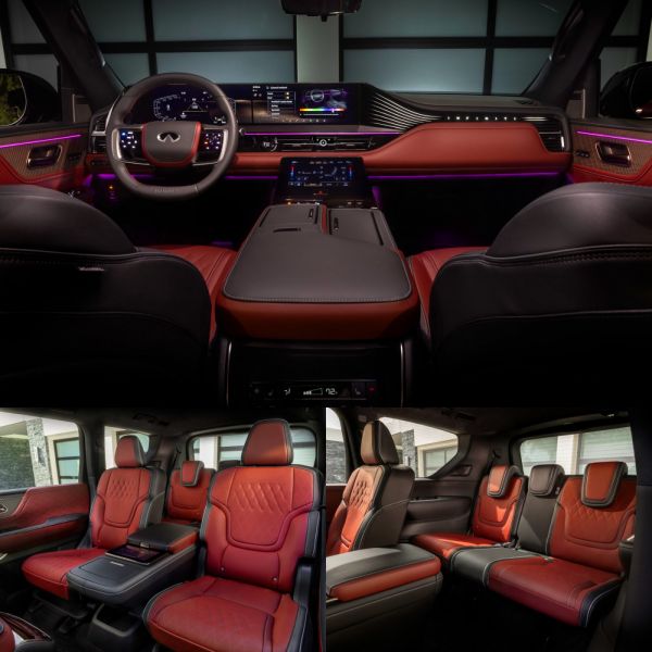 Teljesen digitális lett a belső, az utasok beépített Google alkalmazásokat használhatnak. Javították a helykihasználást, a beltér 2,5 centivel lett hosszabb, de a 2. sor mögött 18%-kal, a 3. mögött 30%-kal lett nagyobb a csomagtér. Minden üléssorban nagyobb lábtér és szélesség várja az utasokat, mind a 7 vagy 8 ülés elektromosan mozgatható. Alapáron 14, extraként 24 hangszórós Klipsh hifit adnak, utóbbinál az első ülések fejtámláiba is kerül 2-2 hangsugárzó. Az Infiniti QX80 olyan funkciókat kínál, mint a Napló-funkció, amikor a jármű orrkamerájával rögzített fotókból készít összeállítást a fejegység egy-egy hosszabb utazást követően.