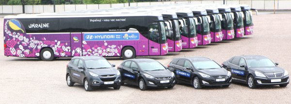 A járműflottát ünnepélyes keretek között, a varsói Nemzeti Stadionban adták át, amely alkalommal a vállalat a 16 résztvevő csapat hivatalos buszát is bemutatta. Ezek mindegyikét az adott nemzet szurkolói által megfogalmazott, a csapatot buzdító szlogenek borítják, amelyeket a Hyundai „Legyen jelen a Hyundai-al” kampányának keretében küldhettek be a rajongók. A szurkolók gondolatait tavaly december óta gyűjtötte a Hyundai, a tizenhat győztest pedig május 7-én hirdették ki. „A labdarúgás dinamikus, izgalmas, szenvedélyes sport, és a Hyundai pontosan ezeket az érzelmeket kívánja közvetíteni ügyfelei felé” – mondta Terry Im, a Hyundai Motor Europe elnöke. „Már csupán néhány nap van hátra a bajnokság kezdetéig, ezért a járművek átadása meghatározó mérföldkő a 2012-es Labdarúgó Európa-bajnokság előkészítésében. A divatos, megbízható és kényelmes járművek elismerten kiváló, globális gyártójaként a Hyundai maga is hozzájárul a bajnokság sikeres lebonyolításához azáltal, hogy minőségi közlekedési megoldásokat biztosít a csapatok, a tisztviselők és a vendégek számára” – nyilatkozta Guy-Laurent Epstein, az UEFA Events SA marketing igazgatója.