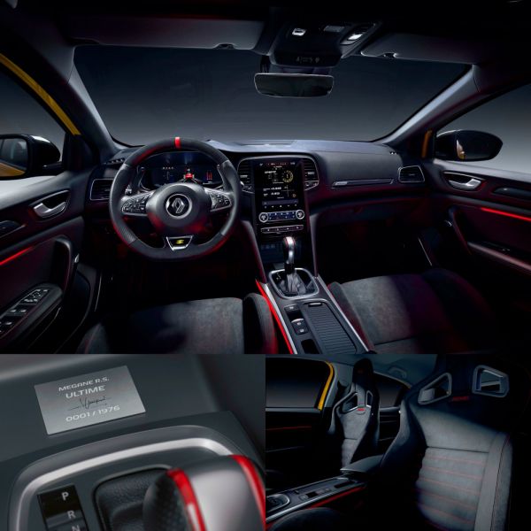 Az új márkajelzésre utaló mattfekete grafikát használnak szerte a karosszérián, 4 karosszériaszín közül lehet választani (fekete, fehér, sárga és narancs), a 19 colos Fuji Light felnik minden esetben fényes feketék. Elöl Alcantara kárpitozású Recaro kagylóülésekben lehet helyet foglalni, a középkonzolon olvashatjuk Laurent Hurgon aláírását – ő a Renault Sport vezető tesztpilótája, aki már 15 éve felel a típus finomhangolásáért, és a Nürburgring-körrekordokat is ő futotta meg. A Megane R.S. Ultime minden lehetséges extrafelszerelést megkap, tehát telemetriai adatokat is mutatni képes 9,3 colos központi érintőképernyőt, körkamera-rendszert, fel-a-fejjel kijelzőt és – balkormányos változatban – opciós tetőablakot.
