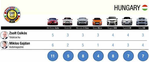 Magyarországot Csikós Zsolt és Gajdán Miklós képviselte a zsűriben, náluk az Alfa Romeo Giulia került az első helyre, a Mercedes E-osztály és a Peugeot 3008-as holtversenyben a másodikra, majd holtversenyben szintén a Toyota C-HR és a Volvo S90/V90 következett, a sort a Citroën C3 és a Nissan Micra zárja szavazataik alapján.