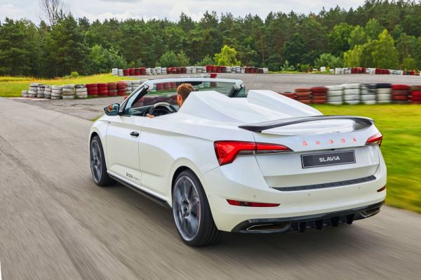 Az utastérben Sparco kagylóülések, négypontos biztonsági övek, fehér csövezéssel és díszvarrással ellátott fekete kárpitozás teremt sportos hangulatot, az ülések közötti panelon lévő két hímzett oroszlán alatt rejtőznek 2250 watt teljesítményű mélynyomók. A Škoda Slavia nagy csomagtartójában két darab Škoda villanyroller szállítására és töltésére van lehetőség. Az 1210 kg tömegű roadstert szériaállapotában meghagyott, 150 lóerős teljesítményű, 7 fokozatú DSG váltóhoz párosított 1,5-ös turbómotor mozgatja.