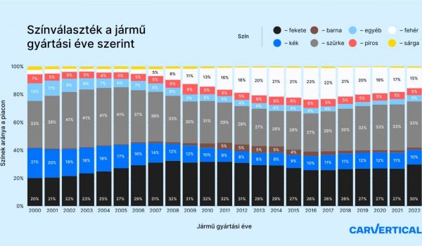 Az európai használtautó-piacon csekély az élénk színű autók aránya – a carVertical portálon ellenőrzött összes jármű 0,9%-a sárga, 5%-a piros, 10,6%-a pedig kék. A sárga korábban sem volt népszerű választás: 2000-ben az autóknak mindössze 2,4%-a, 2010-ben 1,2%-a, 2020-ban pedig 0,7%-a futott ezzel a színnel. A piros valamivel népszerűbb volt, mint manapság: 2000-ben az összes autó 6,5%-a, 2000-ben 5,5%-a, 2010-ben 5,2%-a, 2020-ban pedig 5,2%-a volt piros. A kék járművek aránya az évek során ingadozott: 2000-ben 21,3%, 2010-ben 10%, 2020-ban 11,5% volt.