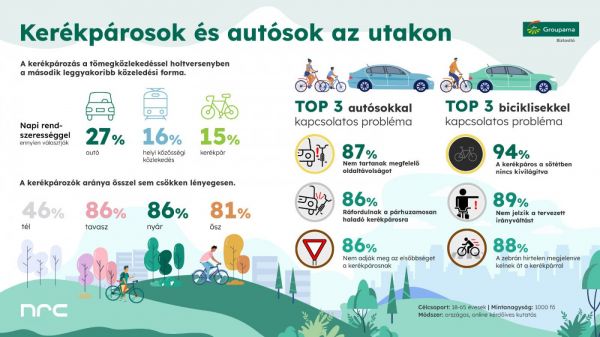 A Groupama Biztosító megbízásából készített országos kutatás is alátámasztja, hogy a kerékpározás egyre népszerűbb hazánkban. A kerékpárt használók ráadásul a kellemetlen időjárási körülmények között sem mondanak le erről a közlekedési eszközről: 42% esős időben, 56% hideg időben, 60% erős szélben is útra kel. Ennek megfelelően nyáron és ősszel is közel azonos számban pattannak a nyeregbe, a nyári 86%-hoz képest őszre mindössze 5 százalékpontos lemorzsolódás vetít előre a kutatás. Az autósoknak ezért nagyon odafigyelve kell közlekedniük ezekben a hónapokban, hiszen romlanak látási viszonyok és csúszósabbá válnak az utak.