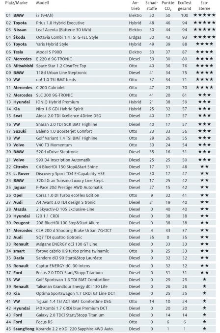 Szigorította az ADAC az általa elvégzett Eco Test vizsgálatsorozatot, az eddigi próbapadon, a szabványok szerint végzett károsanyag-kibocsájtás és fogyasztásvizsgálatok mellé felvették a valós forgalomban elvégzett méréseket. Az új elem 2016. szeptemberi bevezetése óta 45 autó esett át ezen a vizsgálaton, ezeknek az eredményeit közölte most a német klub. A BMW i3-as került az első helyre, a teljes 100 pontos eredményt érte el (50 pont a károsanyag-kibocsájtásra, 50 pont a fogyasztásra), második helyen a Toyota Prius és a Nissan Leaf található 94-94 ponttal, negyedik a földgázas Škoda Octavia G-Tec 93 ponttal. A tesztelt 26 dízelautó közül csak kettő tudott meggyőző eredményt elérni, a Mercedes E 220 d a hetedik 80 ponttal, a BMW 118d a kilencedik 75 ponttal. Kettejük között helyezkedik el a legjobb benzines, a Mitsubishi Space Star 1.2 a maga 76 pontos eredményével.