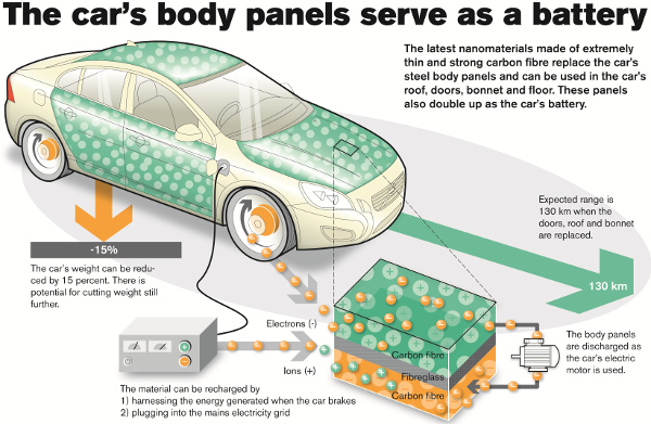 Kilenc szereplő – köztük egyedüli autógyártóként a Volvo Cars – az Európai Unió pénzügyi támogatásával kifejlesztettek egy olyan megoldást, amelynél a könnyű műanyag szerkezeti elemeket energiatárolásra lehet használni. A szénszálerősítéses műanyag elemekben nanotechnológiás akkumulátornak és kondenzátornak alakítanak ki helyet.