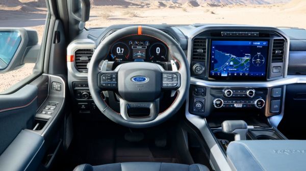 Apropó gázpedál, egyes villanyautóknál már elérhető az egypedálos vezetés, ami jelen esetben a kifejezetten lassú terepjárást – például sziklán araszolás – könnyíti meg azzal, hogy nincs kúszása az autónak. A körkamera-rendszer optikáit úgy helyezték el, hogy azok a megszokottnál jobban a padló felé fordulnak, a tempomatnak van terepfokozata, amikor pedálérintés nélkül tart egy bizonyos alacsony tempót az F-150 Raptor hegynek fel-hegynek le. Az alapáron adott 35 col átmérőjű kerekek helyett 37 col átmérőjű kerekek is kérhetőek, utóbbiakkal a 30,5 centis hasmagasság 33,3 cm-re emelkedik, javulnak a terepszögek is (első: 31° kontra 33,1°, hátsó 23,9° kontra 24,9°, rámpaszög 22,7° kontra 24,4°).