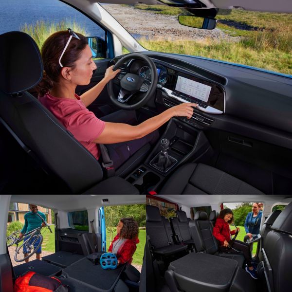 Alapesetben analóg műszerek kerülnek a kormány mögé és 8,25 colos képátlójú érintőképernyő középre – fizikai kapcsolók helyett menüből lehet vezérelni a funkciókat –, extraként elérhető 10,25 colos képátlójú vetített műszeregység és 10 colos képátlójú központi érintőképernyő. Felár ellenében összesen 19-féle vezetőtámogató rendszer kérhető. A motorkínálatban megegyezik azzal, amit a VW Caddy is kínál, tehát az 1,5 literes TSI (jelen esetben EcoBoost néven) 114 lóerős, a 2,0 literes TDI (jelen esetben EcoBlue néven) 102 vagy 122 lóerős, a feláras PowerShift váltó is a hétfokozatú DSG-egységet takarja. A Ford Tourneo Connect esetén újdonságnak számít, hogy a 122 lóerős dízelhez felár ellenében összkerékhajtás is választható, ehhez lehet kérni megerősített alsó védelmet is.