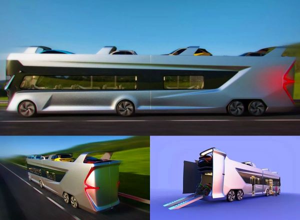 A hatótávolság mellett az elérhető töltési lehetőségek is gondot jelentenek a villanyautóval való hosszú távú utazásoknál, erre próbál megoldást nyújtani a francia Symone startup a luxusbuszával, amely 4 autót és azok utasait tudja teljes kényelemben hosszú távra szállítani, és így nem csak a vezetés terhét veszi le a sofőrről, de az autóban el nem érhető kényelmi szolgáltatásokat is biztosít. 5 autónak vagy 4 autónak (fent) és 5 motorkerékpárnak (lent) van helye, az utastérben 18 kényelmes fotel található külön vezérelhető multimédia rendszerrel.