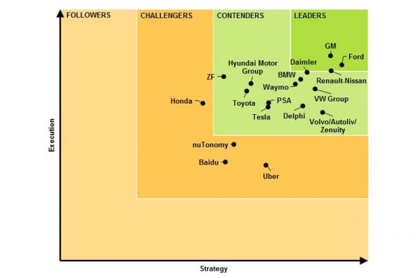 A Navigant nevű tanácsadócég a robotautó-fejlesztéssel foglalkozó 18 vállalkozás helyzetét vizsgálta meg legújabb jelentésében, és arra a következtetésre jutott, hogy egyelőre a hagyományos autógyártók állnak nyerésre. Tíz szempont alapján vizsgálták meg a vetélytársakat, amely alapján a Ford vezet, második helyen a General Motors áll, majd a Renault-Nissan szövetség következik, a vezetők kategóriájába még a Daimler konszern fért be. Az első technológiai cég a Google leányvállalata, a Waymo a hetedik tudott lenni.