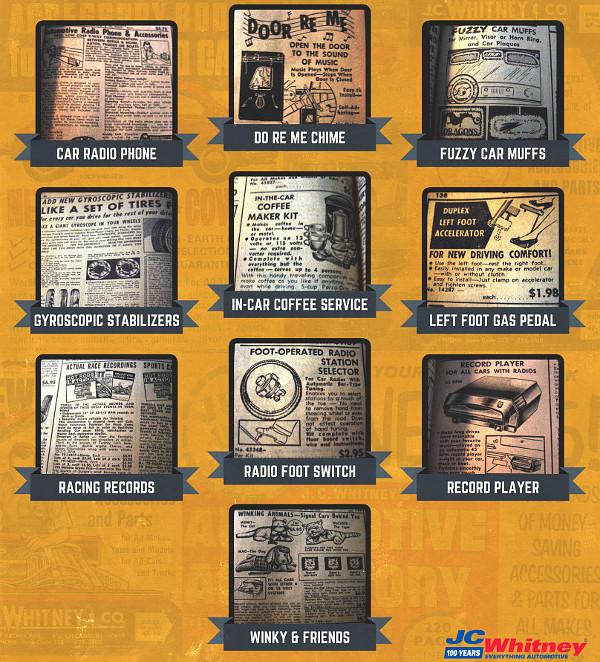 Ahogy manapság a különféle üzemanyagfogyasztás-csökkentő termékek jelentik a slágert a nevetséges autós kiegészítőknél, úgy már régen is megvoltak a hasonlóan nevetséges autós kiegészítők. Az Egyesült Államokban 100 évvel ezelőtt alapították meg a JC Whitney céget autós kiegészítők forgalmazására, és bizony az évek-évtizedek alatt rengeteg különös terméket kínált katalógusaiban.