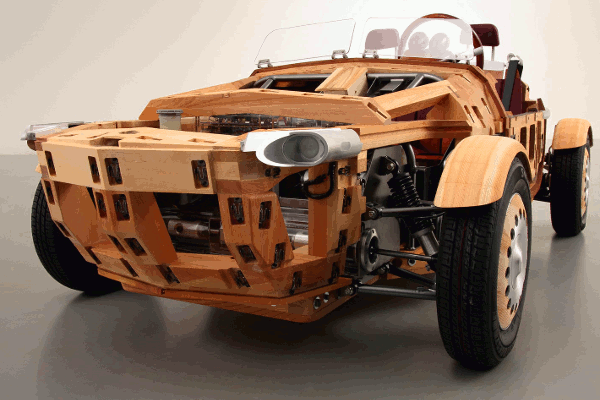 Összesen 86 darab kézzel megformált fa alkatrészből áll össze a karosszéria és az utastér burkolata, amely során az okurari elnevezésű technikát használták, azaz szögek nélkül csatlakoznak egymáshoz az egyes elemek, az ékkel szétfeszített csapok egyenként több réteget fognak össze, és oldható kötésről lévén szó javítást is lehetővé tesznek.