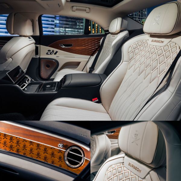 Kétszínű, mármint finisű karosszériát kapott a The Surgeon, azaz Sebész névre keresztelt Bentley Flying Spur limuzin, hiszen a fényes antracitot selymesfényű antracittal kombinálták, ehhez selymesfényű bronz karosszériadíszek járnak, a kocsi orrán lévő márkajelzést fényes feketére fényezték. Mindez Dominic Ciambrone cipőkészítőnek köszönhető, aki még a saját, sebészmaszkos kalózlogóját is bőven elhelyezte az utastérben.