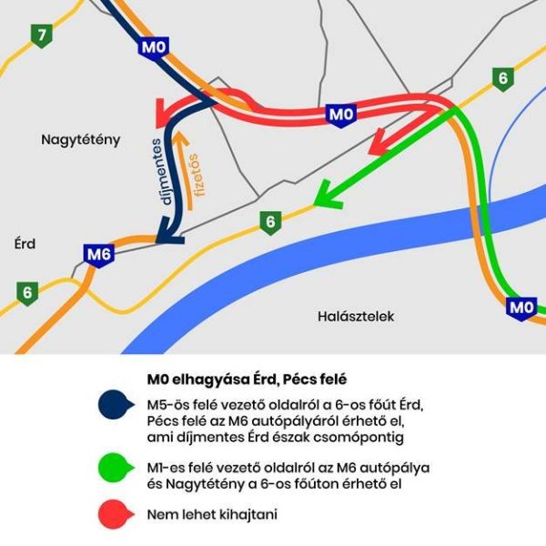 Az M0-ás autóút fejlesztési munkálatai miatt díjmentesen közlekedhetnek az autósok keddtől az M6-os autópálya M0-ás autóút – Érd észak csomópont közötti szakaszán, Érd irányában, a visszafelé tartó szakasz azonban továbbra is fizetős – tájékoztatta a Magyar Közút Nonprofit Zrt. kedden az MTI-t.