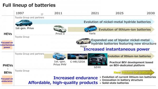 A japánok nem csak a környezeti hatás mértéke miatt foglalkoztak csak kis szériában villanyautókkal, hanem azért is, mert a jelenlegi lítium-ion technológia még számos gyermekbetegséggel küzd. Ezek közül sokat kiküszöböl majd a szilárdtest-akkumulátor, amelyek megjelenését nagy szériában 2025-re teszik. Ezek a hosszabb életű, nagyobb energiasűrűségű és biztonságosabb akkumulátorok már olyan ügyfél-előnyöket nyújtanak, hogy a Toyota most bejelentette: még ebben az évtizedben 14 milliárd dollárt, azaz 4150 milliárd Ft-ot fordít ezekre. Ebben az összegben benne van a fejlesztés, illetve 2030-ig bezáróan globálisan 200 kWh saját gyártókapacitás kiépítése is. A Toyota úgy számol, 2030-ban 8 millió öntöltő/plug-in hibrid autót és ezeken felül 2 millió akkumulátoros-elektromos/tüzelőanyagcellás-elektromos autót fog gyártani.