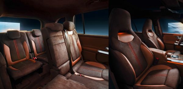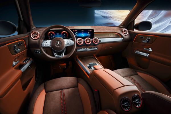 A műszerfal kialakítása ismerős, ami új, az a gesztenyeszínű nappa és nubuk bőr borítás, de narancs és vörös szín is megjelenik foltokban. A fabetét az egyébként a karbiókban alkalmazott, nyílt pórusú mogyorófa, a bevésett méhsejt-minta a széle felé halványodik. Még a pedálok is ilyen borítást kaptak. A két képernyős MBUX műszerfalon az alsó dekoratív tartók jelentik az újdonságot.