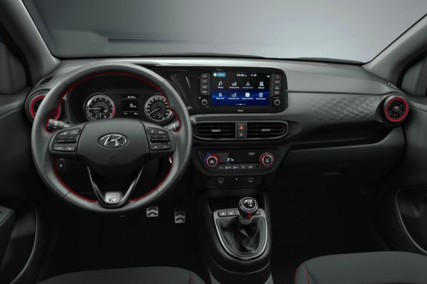 Az utastérben fekete hangulat, sportkormány jelent eltérést a normál i10-hez képest. A legnagyobb változás, hogy 1,2-es szívómotor (84 LE/118 Nm) helyett 1,0 literes turbómotor hajtja az első kerekeket, a teljesítmény 100 lóerő, a maximális nyomaték 172 Nm. A váltó itt is ötfokozatú, kézi kapcsolású, de rövidebb az áttételezés.