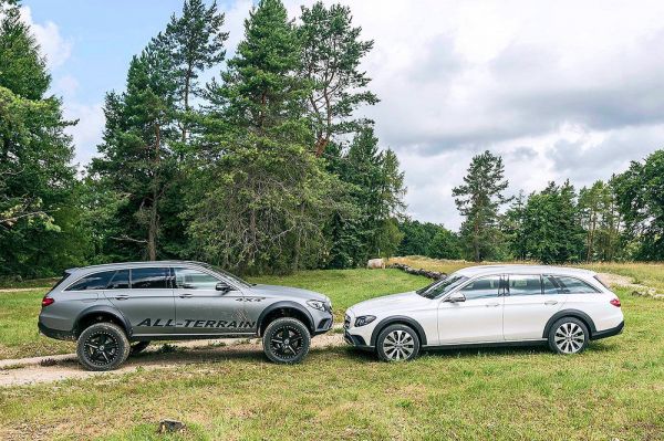 A Mercedes E-osztály All Terrain 4×4 a négyzeten alapjául egy E 400-as kombi szolgált, amelyet először is All Terrain megjelenéssel láttak el, majd megkapta az új felfüggesztést. A gyár eredetileg nem akarta ezzel a motorral kínálni a szabadidő-autós körítésű kombit, de annyira megtetszett ez a változat az illetékeseknek, hogy mégis megvalósítják ezt – a széria, 16 centis hasmagassággal. Az E-osztály prototípus 42 centis hasmagasságával még a G-osztályon is túltesz (37 centi a vonatkozó érték), az első terepszög 35,8°, a hátsó terepszög 35, 6°, a rámpaszög 31,7°, a gázlómélység 50 centi. Egyelőre nincs szándékában a Mercedesnek sorozatban kínálni a független portálhidakkal szerelt E-osztályos kombit, de nem is zárkóznak el tőle. Meglátjuk, mit hoz a jövő.