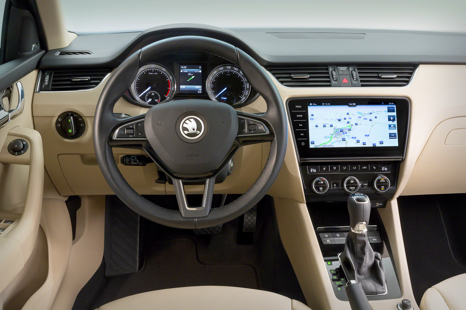 A külső megjelenés átalakítása a legnagyobb változás, az utastérben új fejegységeknek örülhetnek a vásárlók, a legdrágább Columbus navigációnál minden eddiginél nagyobb, 9,2 colos képátlójú az érintőképernyő – ezt látjuk a műszerfal fotóján –, ez a készülék wifi hotspotként is működik. Érdekes módon az autóhoz távoli hozzáférést biztosító CareConnect szolgáltatás a földgázas G-Tec változathoz nem választható. Bővült a felár ellenében elérhető vezetéstámogató rendszerek sora, például lassú tolatásnál a kívánt helyre tudja irányítani az utánfutós szerelvényt az elektronika, a koccanásgátló gyalogosfelismerő funkcióval tud többet, a holttérfigyelő immár radaros érzékelővel dolgozik.