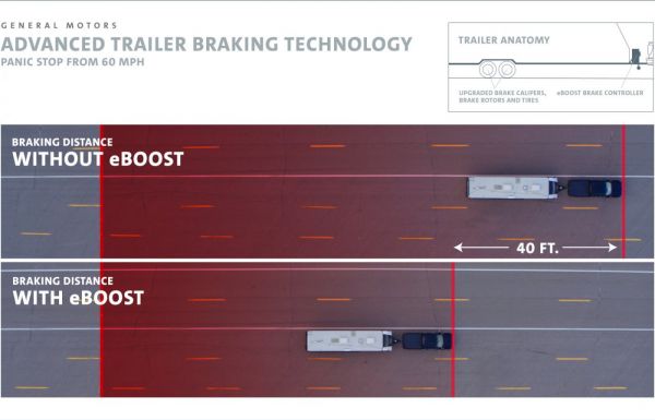 A General Motors mérnökei az utánfutókat vontatóknak kedveskednek legújabb ötletükkel, az eBoost néven bemutatott technológia tulajdonképpen azt jelenti, hogy rendes fékrendszerrel látják el a vontatmányt. Egy villanymotoros pumpa felel a megfelelő féknyomás generálásért, a kerekekre a személyautókon is használt nagy teljesítményű fékeket szerelnek, az elektronikus vezérlés a vontatójárműtől érkező jel alapján dolgozik. Oldalanként is képes fékezni a rendszer, tehát a menetstabilizálásból is kiveszi a részét az eBoost, amely sokkal jobb fékhatást tud elérni, mint a mai ráfutófékes rendszerek. Számszerűsítve 96 km/órás tempóról lassítva ötödével, azaz 12 méterrel rövidebb a szerelvény fékútja. Arról nincs hír, hogy mennyivel drágítja meg ez a rendszer az utánfutókat, illetve hogy mikor számíthatunk a megjelenésére a közutakon.