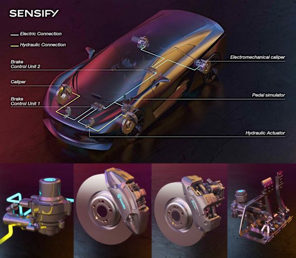 Amíg hagyományosan a vezető lába állította elő a féknyomást szervo segítségével, újabban már nagynyomású szivattyú felel ugyanezért, a vezető lába pedig csak a szabályzószelepre hat. A Brembo által most bemutatott, Sensify névre keresztelt rendszer újdonsága, hogy annál nem (csak) központilag szabályozzák a féknyomást, hanem a vezérlőelektronika kerekenként képes erre egy elektronikusan vezérelt aktuátor segítségével. Ez különösen kanyarban javítja a fékezési tulajdonságokat azzal, hogy a rendszer képes figyelembe venni a dinamikus terhelésváltozást, de az eltérő tapadású talajra is képes reagálni a rendszer.