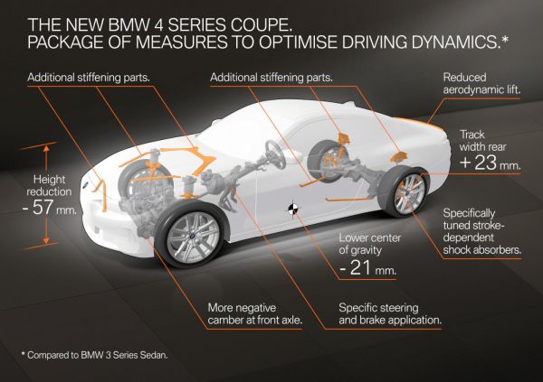 Ahogyan hajtáslánc-koncepciója és formanyelve, úgy az új BMW 4-es Coupé futómű-technológiája is minden eddiginél egyedibb konstrukció. A karosszéria arányai és aerodinamikai tulajdonságai, illetve az új 4-es BMW tengelyek közötti terhelés-elosztása ideális műszaki alapot teremt a hamisítatlanul sportos menetdinamikát ígérő futómű-technológia innovációinak. A nóvum még az új BMW 3-as limuzinnal összemérve is látványos eredményeket produkál: légellenállási együtthatója például további 0,015-tel csökkent, miközben magassága 57 milliméterrel, súlypontja pedig 21 milliméterrel lentebb került.
