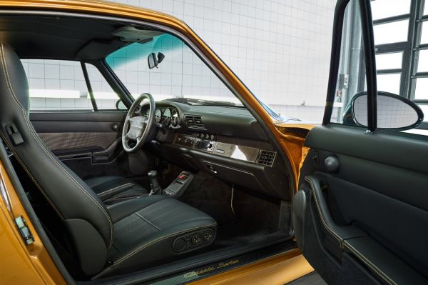 A belső térnél lehet találkozni a legtöbb változtatással, nemcsak a fekete-arany színvilág az egyedi, de a karbonnal se spóroltak. Az első ülések egyedi darabok, amelyek modernebb 911-esből származnak, de a régi karosszériához igazították a felfogatásukat. A tetőkárpit kétrétegű, a sárga alapra húzták rá a fekete borítóréteget, a világos szín átsejlik. Előszedték a korabeli varrógépet ahhoz, hogy az eredetinek megfelelő varrásokat használjanak, és csak sokadikra sikerült megfelelő kárpitokat varrni, mivel nem volt képes egyenes vonalban varrni a régi masina, úgyhogy az anyagot kellett kézzel a megfelelő pályán mozgatni az egyenes varrásokhoz.