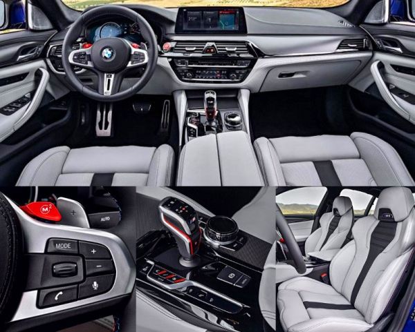 Ezeken tökéletesen látható a hatalmas méretű első légbeömlő, a 20 colos felnik a 275/35 ZR20 méretű abroncsokkal, vagy épp a négy darab kipufogó-végződés. Nagy újdonságot a belső tér fényképein látni, mégpedig azt, hogy a kormány karimája mögött nem csak a bajuszkapcsolókat, a 8 fokozatú automatikus váltót vezérlő füleket helyezték el, de ide került még két darab piros M1 és M2 kapcsoló is; úgy tűnik, a küllőkön már nem jutott hely ezeknek. Ezek a gyorsbillentyűk az előre beprogramozott üzemmódokhoz, egyébként az M3/M4-ből ismert módon az előválasztókar melletti kapcsolókkal lehet vezérelni a motor, futómű és kormányzás finomhangolását.