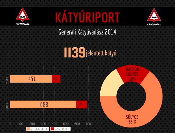 Bár sokan csak kellemetlenségként tekintenek a kátyúkra, 2013-ban 210 személyi sérüléssel végződő balesetet okoztak úthibák. A Kátyúvadász program célja lehetőséget biztosítani a vezetőknek arra, hogy megosszák a kátyúkról szerzett információikat egymással és a hivatalos szervekkel. Tavaly az adatbázisban már 1139 kátyú volt megtalálható, ebből pedig 688-at töltöttek fel az év során. Ez több mint a duplája a 2013-as évinek. Az alkalmazás felhasználói bázisa tehát folyamatosan növekszik, ezt pedig hűen tükrözik a számok is: a rekordtartó Nógrád megyében például 2013-hoz képest 98%-kal több kátyút jelentettek. Ugyancsak Nógrád megyében voltak a legaktívabb útkezelők is: az összes bejelentett kátyúból csupán egyet nem javítottak ki. A legnagyobb számban Békés megyéből töltöttek fel adatokat: itt az autósok összesen 170 kátyút találtak. A második helyezést 153 darabbal Pest megye tartja.
