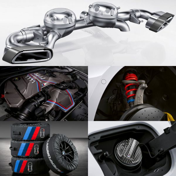 A csomagban összesen 19-féle karbonból sütött külső légterelő elemet találunk, négyféle sportkormány közül lehet választani, van nagyteljesítményű fékrendszer, rögtön két pillangószelepet tartalmazó kipufogó, zsákok a nyári/téli abroncsok tárolására, az M5-öshöz autótakarót is kínálnak. Ötféle, 19 vagy 20 col pántátmérőjű kovácsolt alufelni közül lehet választani. A BMW 5-ös és M5 M Performance kiegészítői már elérhetőek a kereskedőhálózatban.