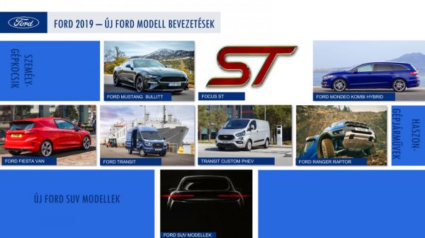 A Ford a 2019-es évre is tartogat meglepetéseket. A személyautó piacra május körül érkezik majd a Mustangból már ismert 2.3 Ecoboost motor 280 lóerős változatával szerelt Focus ST 5 ajtós és kombi kivitelben. Idén érkezik a megújult Mondeo, mely hibrid változata Kombi kivitelben is elérhető lesz. A legnagyobb dobást azonban az év végére tartogatja majd a Ford, amikor is SUV családjába érkezik számos megújult, vagy éppen Európában most először bemutatkozó modell, köztük a vadonatúj Kuga, és az eddig csak a tengerentúlon kapható Explorer legújabb változata is. És az újdonságoknak ezzel még koránt sincs vége, hisz idén várható a Craiovában készülő újabb B platformos kis SUV (Puma), sőt az 2019 végén bemutatkozó teljesen elektromos új Ford SUV is, melyhez az ihletet a legendás Mustang adta. A haszongépjármű piacon ugyancsak izgalmas év várható a Fordnál, hisz érkezik a megújuló Ranger mellett a különleges, tereprallyra termett Ranger Raptor is. A városi áru- és személyszállításban pedig az megújuló Tranzit modellek és az ősszel érkező, környezetbarát Transit Custom PHEV segít, mely 1.0 Ecoboost motorja mellett hálózatról tölthető akkumulátora akár 50 km tisztán elektromos használatot is lehetővé tesz majd.