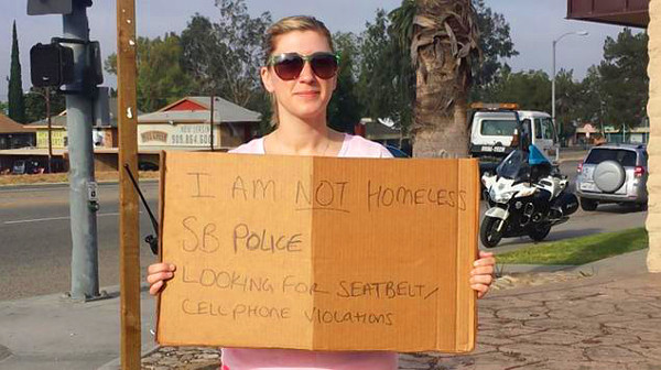 Ha nem is megszokott látvány, de nem is számít különlegesnek az Egyesült Államokban, ha valaki az út szélén koldul úgy, hogy a kezében tartott kartonpapírra írja rá, miért is kér pénzt. Ezt a jelenséget használták ki a kaliforniai San Bernardino városának rendőrei, akik közül összesen négyen álltak oda egy autóút-lehajtóhoz, hogy ott azt ellenőrizzék, a vezetők használják-e a biztonsági övet és nem telefonálnak-e vezetés közben.