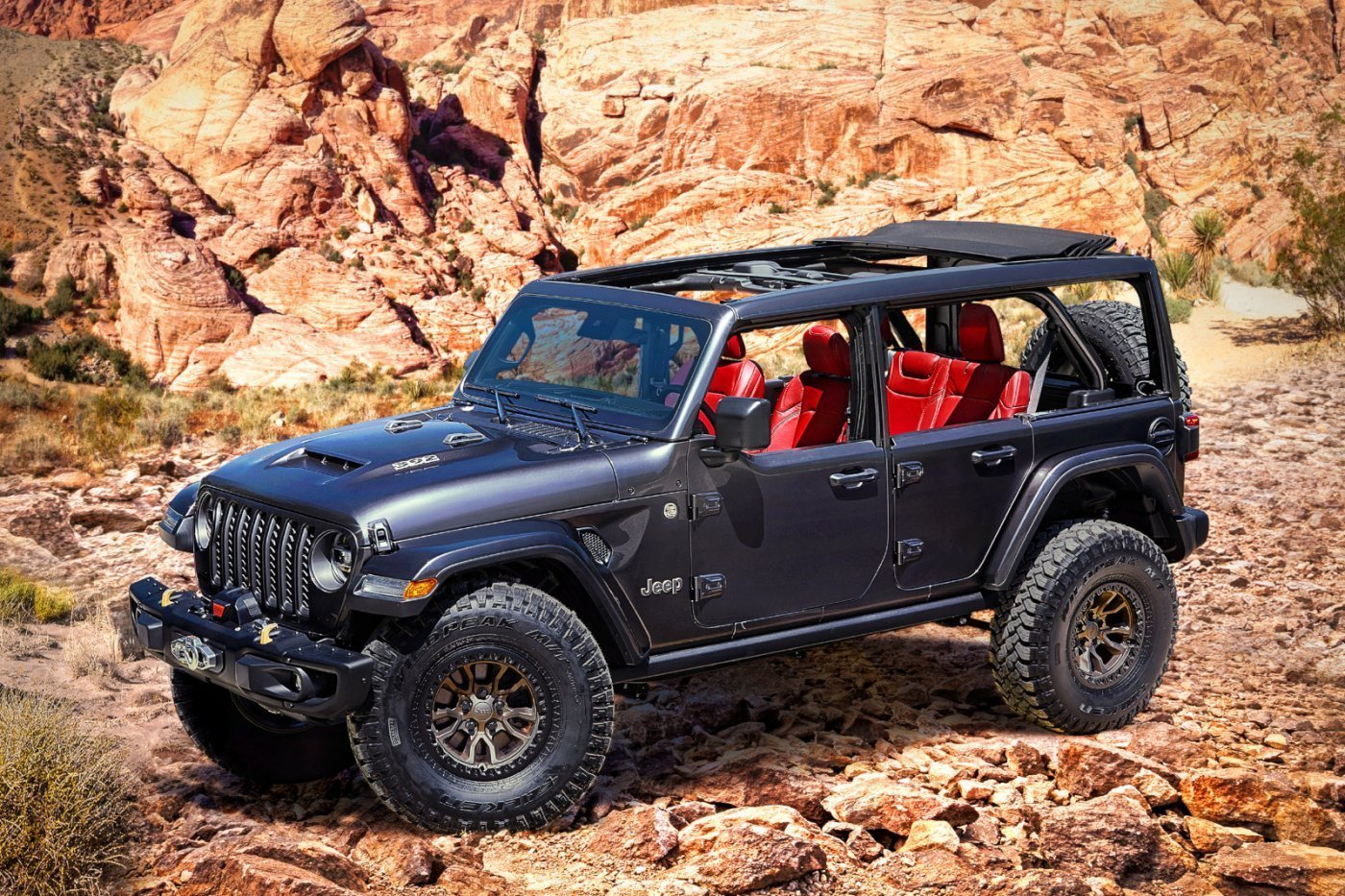 Azt már korábban elárulta a Jeep, hogy a Hellcat blokkot azért nem építik be a Wrangler karosszériába, mert azzal nem teljesítene jól a törésteszten a típus, a Rubicon 392 tanulmány esetén azonban nem feltöltött, hanem szívó V8-ast használnak. Nem tudjuk, hogy ezzel hogyan viselkedik a hivatalos törésteszten az autó, de harminc ilyen prototípust is építettek, amelyeket közúton is tesztelnek, szóval egész jó az esély a sorozatgyártásra. A 6,4 literes lökettérfogatú HEMI V8-as 450 lóerő és 610 Nm teljesítményű, megerősített nyolcfokozatú automatikus váltó csatlakozik hozzá, elöl-hátul Dana 44-es hidakat használ 3.73-as végáttétellel. A karosszéria érdekessége, hogy az ötajtós Unlimited felépítményt egyébként nem elérhető keret nélküli félajtókkal kombinálják.