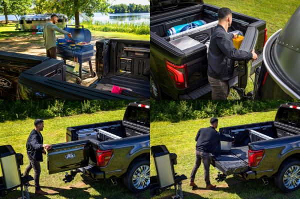 A felfrissített Ford F-150 pickup legérdekesebb újdonsága a Pro Acces Tailgate nevű platóajtó, amelynél egy elég széles oldalra nyíló ajtót helyeznek el középen, ennek a megközelítését lehajtható lépcső könnyíti meg. Az oldalra nyíló ajtószárny több pozícióban (37, 70 és 100°) is rögzül, így még vontatmány csatlakoztatása esetén is könnyen használható ez a praktikus extra.