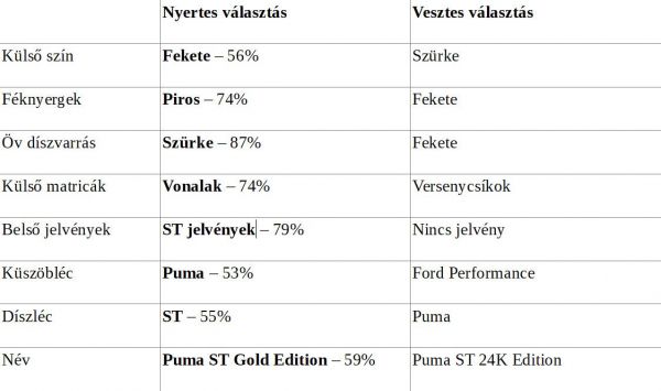 Ha nem is volt teljes a választás szabadsága, hiszen minden területen két opció volt, de azért így is premiernek számít a Ford Puma ST Gold Edition összeállítása, hiszen arról interneten lehetett szavazni. Az egyes importőrök tíz napon át gyűjtötték a voksokat saját közösségi csatornáikon, majd a részeredményeket a kölni központban számolták össze, az alábbi arányban nyertek az egyes opciók: